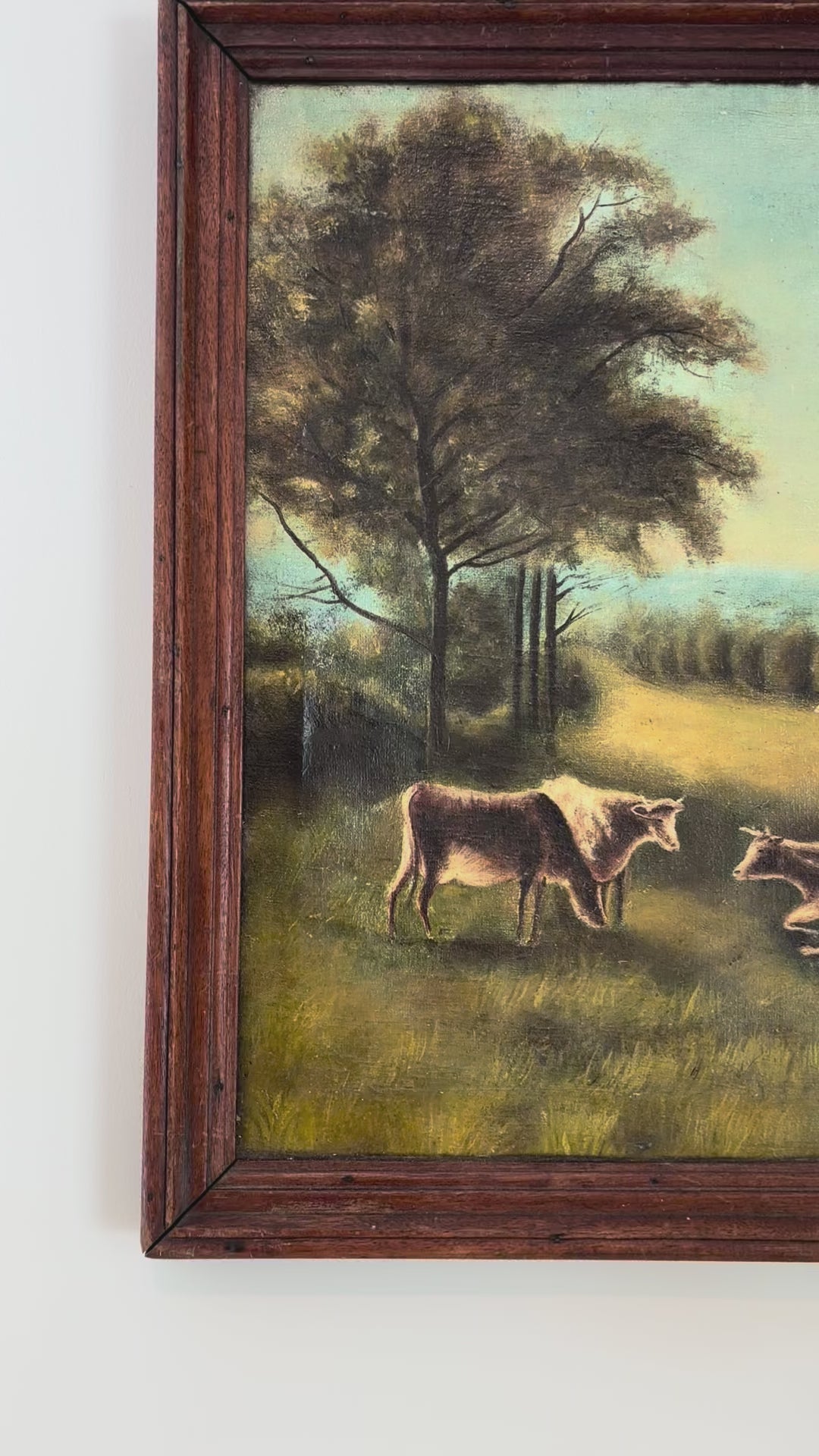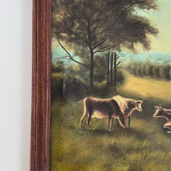 Antique original framed oil painting of cows in pasture signed by a European artist with the last name Vandermenschen and dated 1915. Reminiscent of the Flanders countryside with its rolling hills. Some paint loss due to its antique age. 15.5" x 19.5"