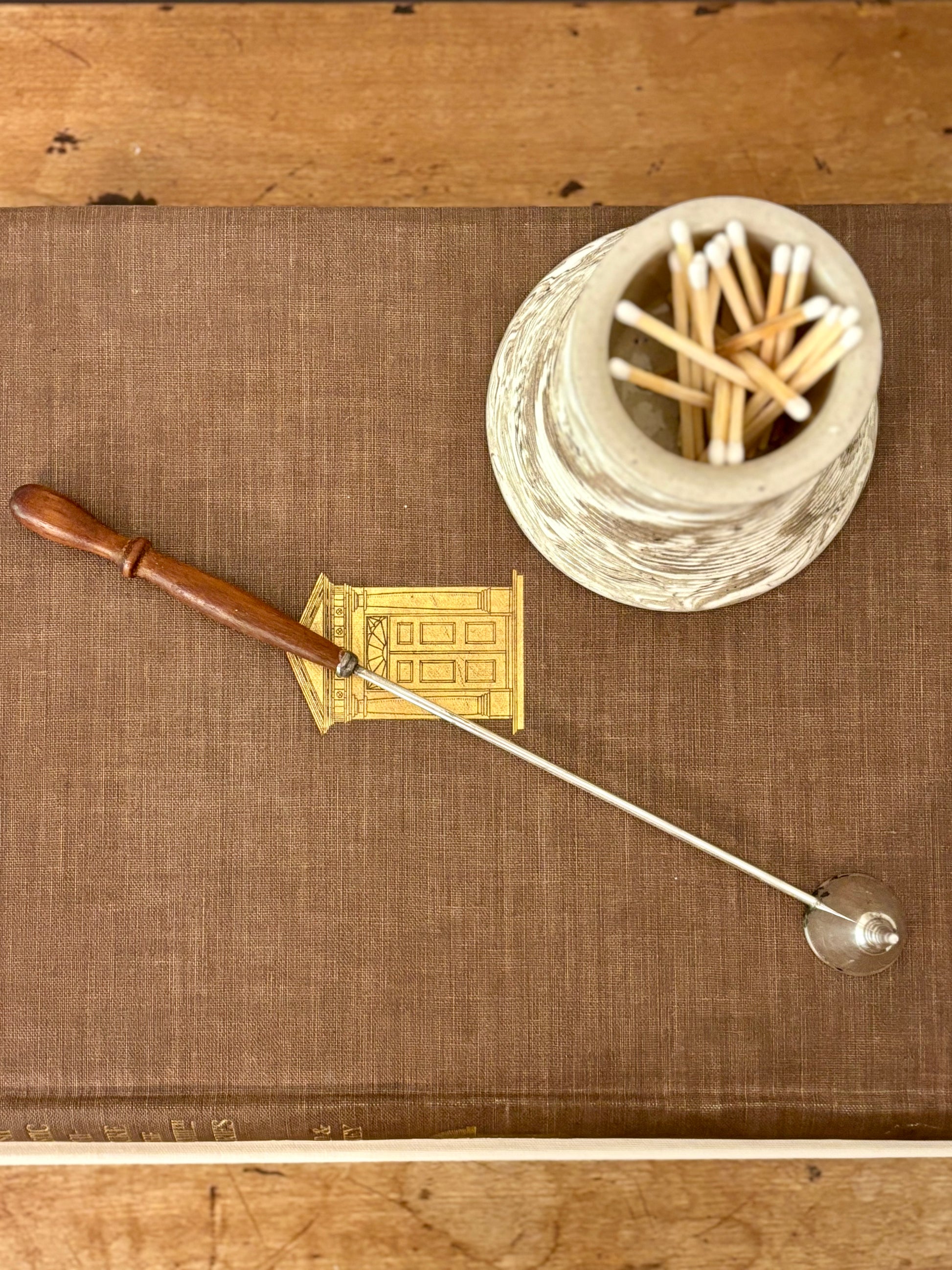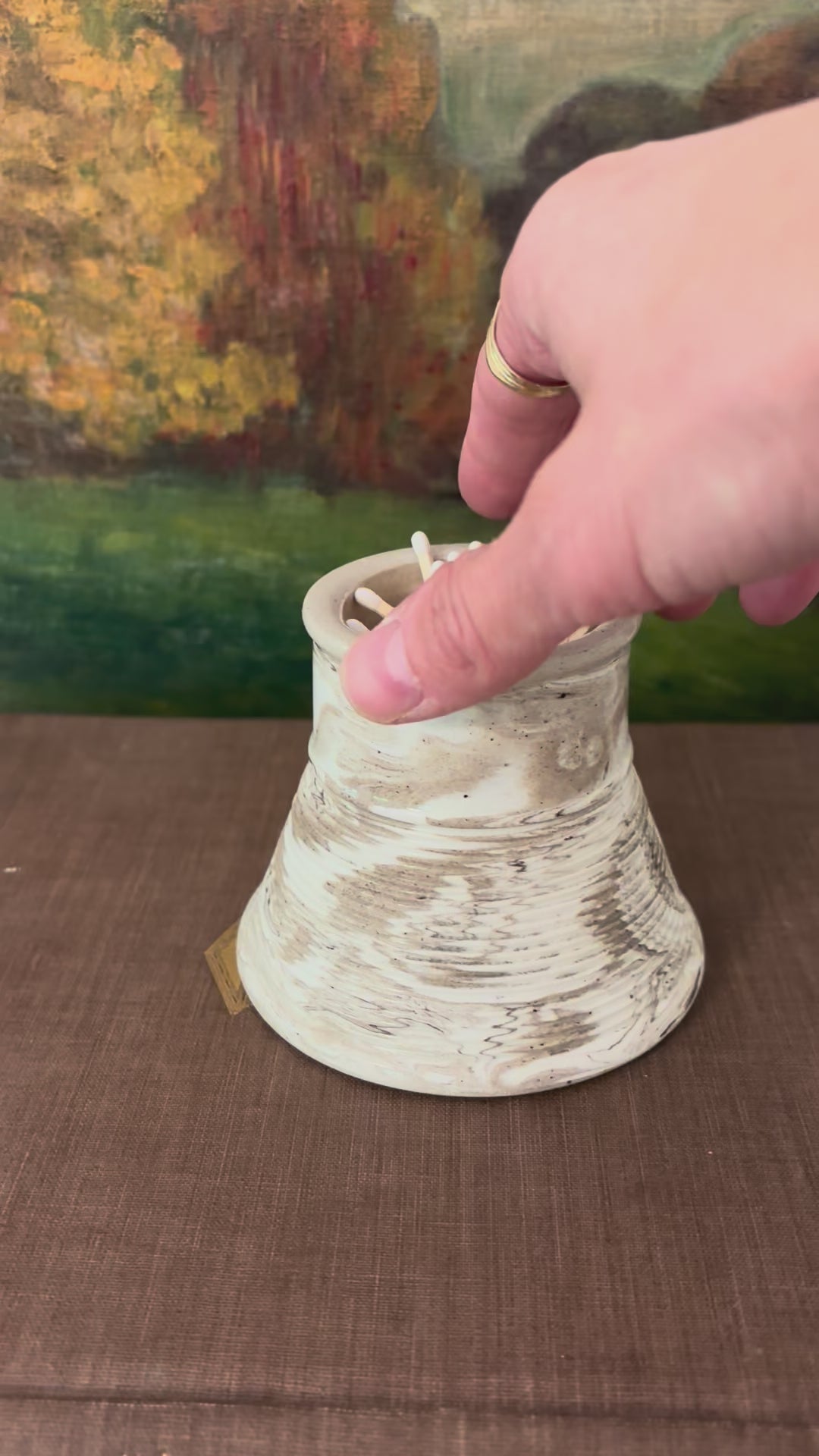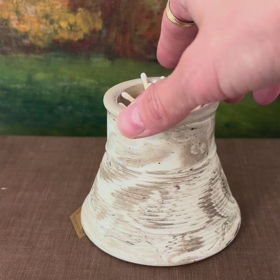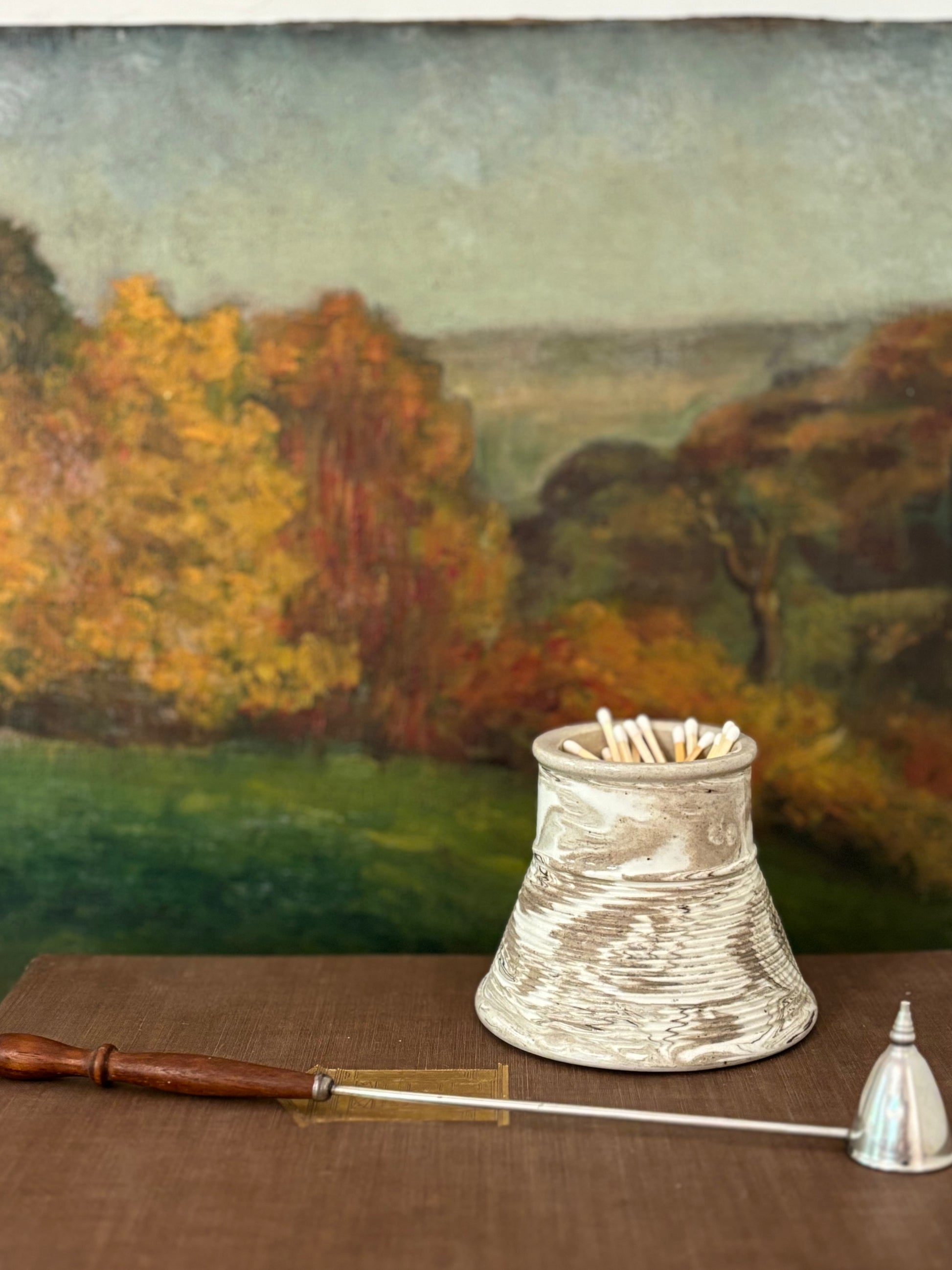 Antique French ceramic match striker, also known as a pyrogène, with beautiful neutral swirl design. In the early 20th century, a pyrogène would be used at a cafe table so customers could light their cigarettes. 3.75" wide base x 3" tall.