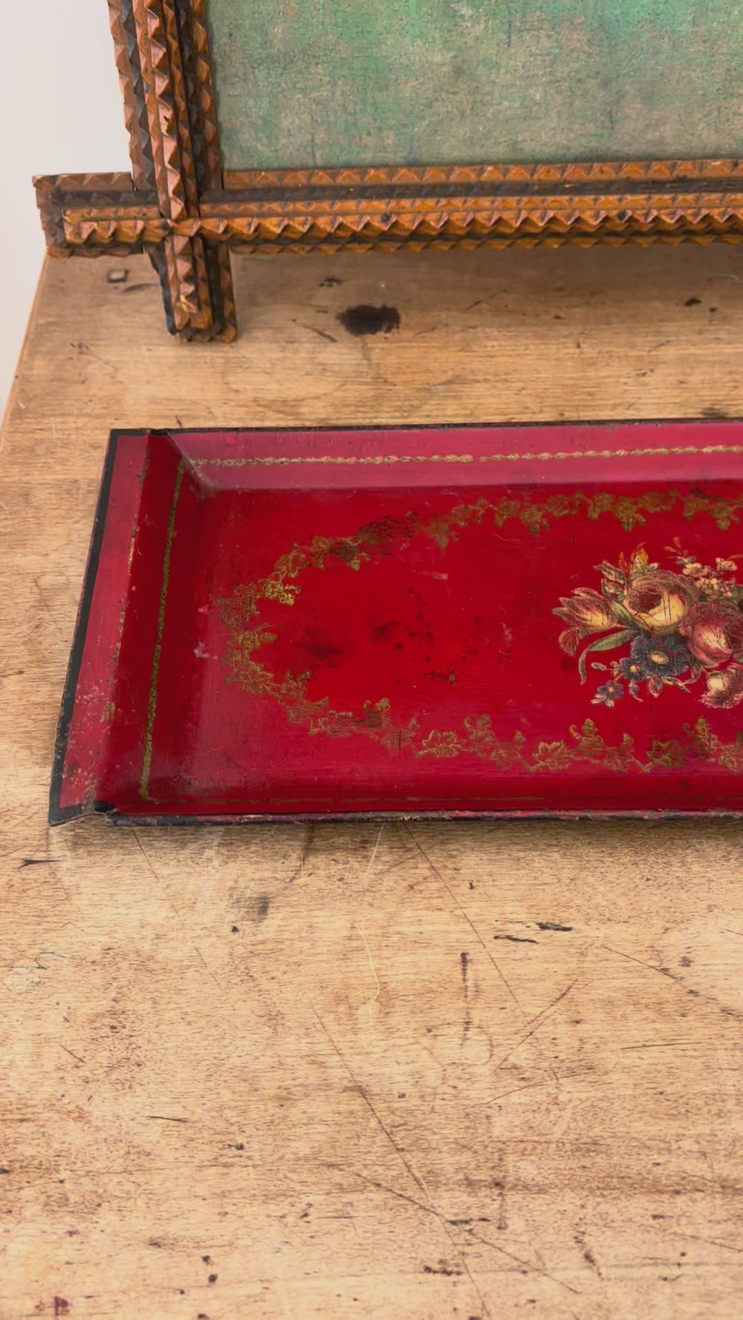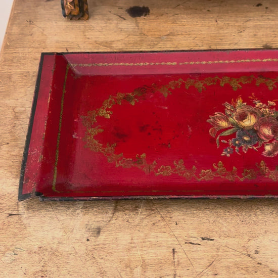 Antique French hand-painted tole metal tray. Beautiful red color with stunning painted floral details and striking black trim. The perfect size for holding pieces on a table top to create a collected vignette. This is truly a special, one-of-a-kind decor piece. 14.25" l x 6" w