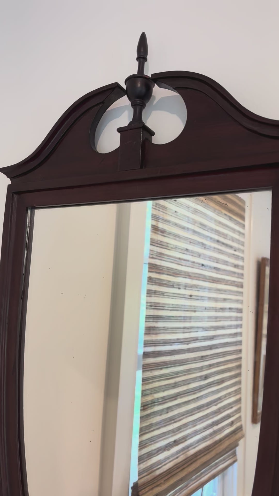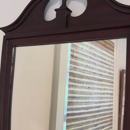 This stately antique mahogany shield style mirror is a one-of-a-kind piece. It will make a statement with its hand carved details and unique shape. It can make a small area or room like a powder room really sing. It has a sticker on the back that reads "Finisher No. 5". It is ready to hang. 14.75" w x 28" h