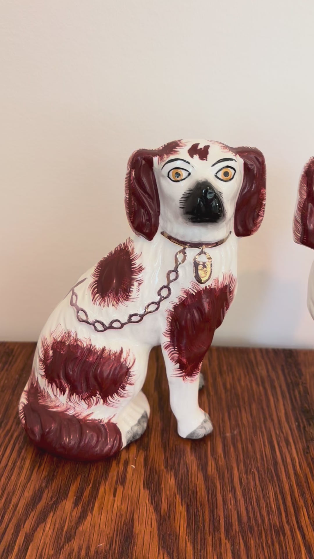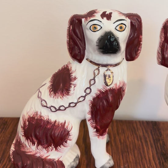 Antique pair of Staffordshire Spaniels in excellent condition. Each is roughly 5" long x 3" deep x 6" tall.