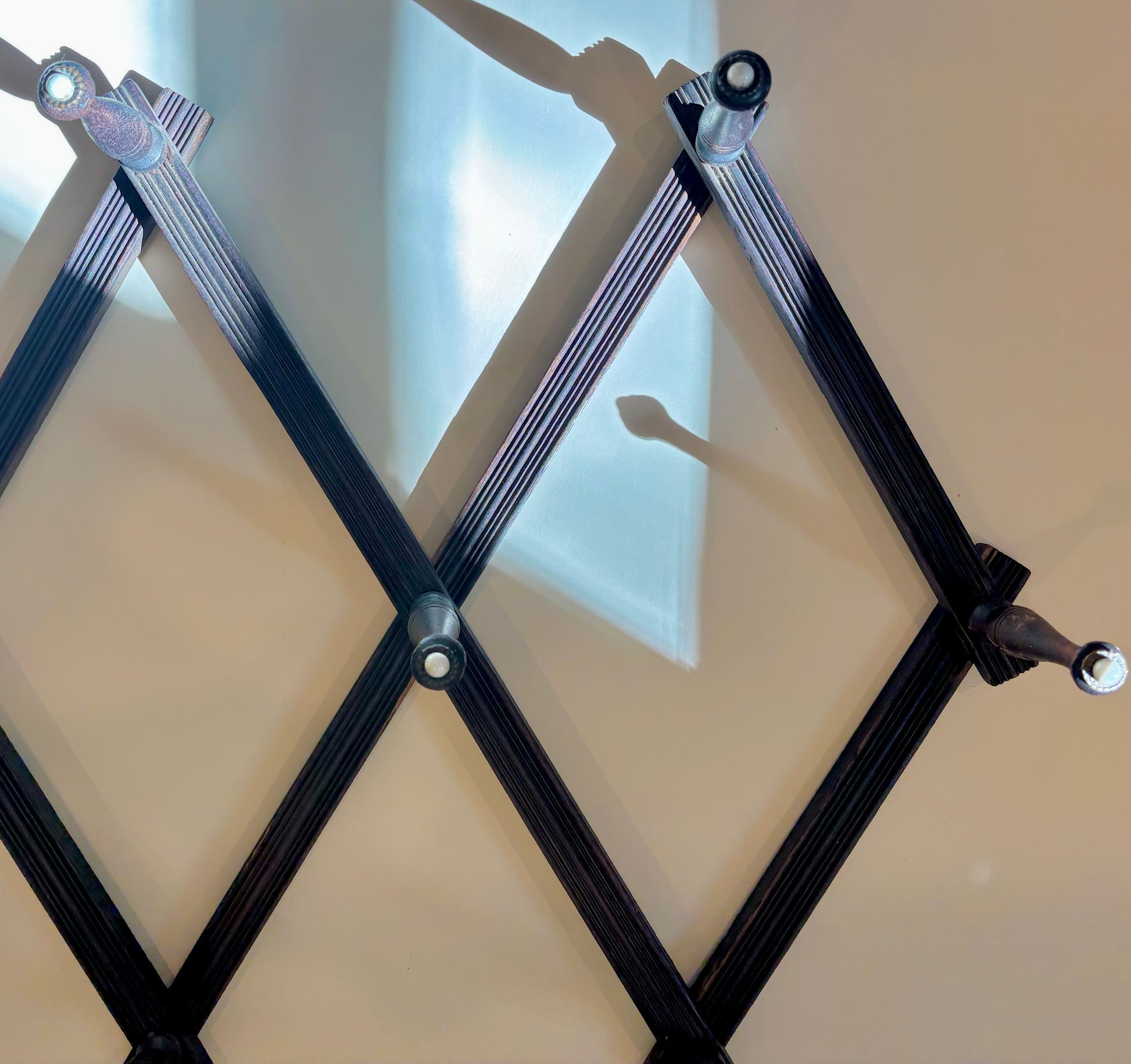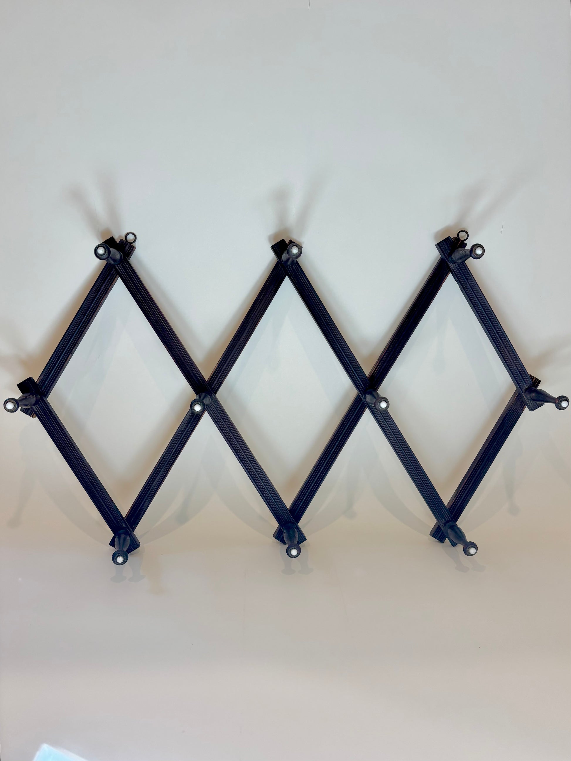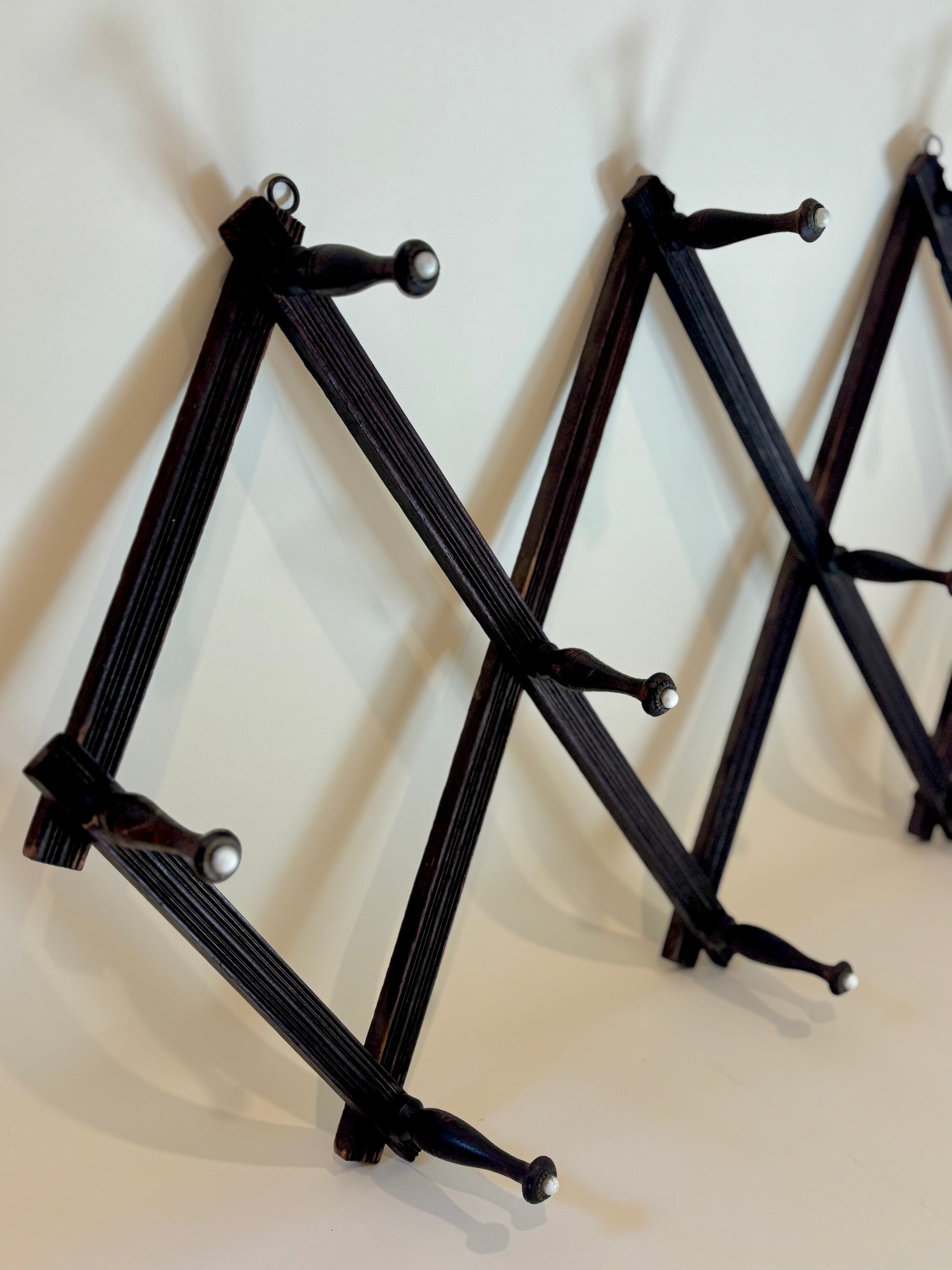 Antique victorian ten peg accordion rack with porcelain buttons surrounded by brass. I envision this in a mudroom to add vintage charm or a small entryway or nursery. It is ready to hang but it is delicate due to its late 1800s age. When expanded it is roughly 17" h x 36" l x 5" d