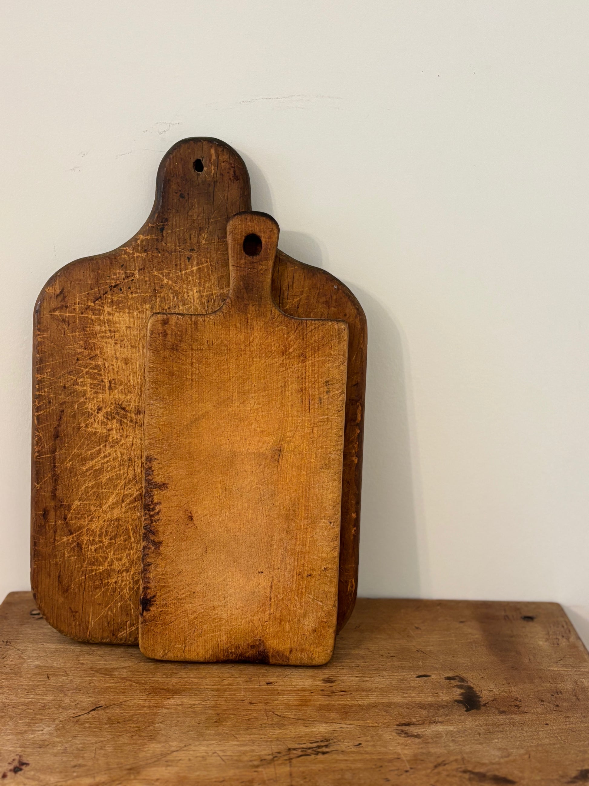 Primitive bread cutting board with beautiful patina from usage. Would look stunning hanging on a kitchen wall or propped up on a kitchen counter. 9" x 14"