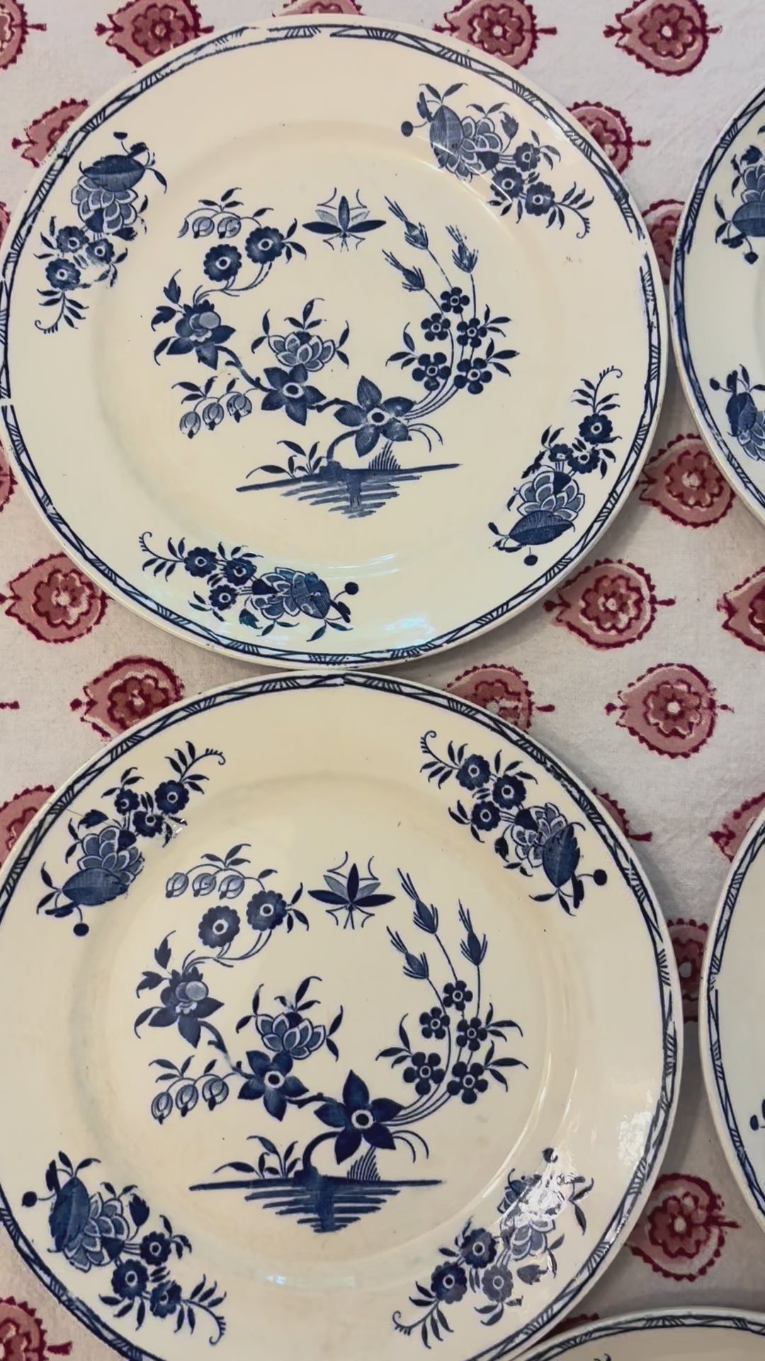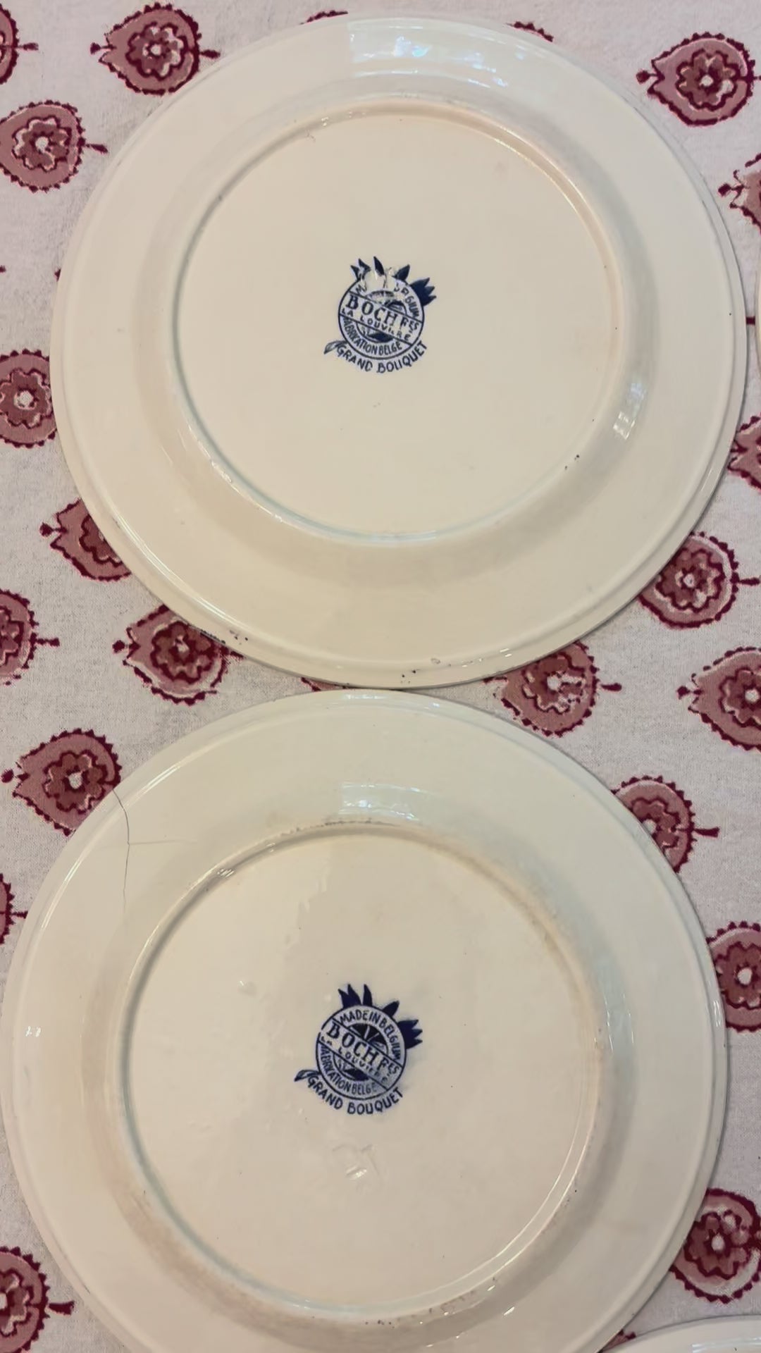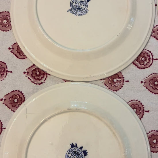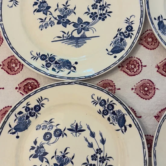 Set of five vintage dessert plates by the well-known Belgian manufacturer, Boch Frères, known for their faience. This blue and white pattern is known as their Grand Bouquet series and features a whimsical dragonfly. One plate has a small hairline crack on the outer edge as noted in my videos/photo. Each plate is unique and there is crazing present as these are likely from the 1920s-1950s. Each is 7.75" in diameter