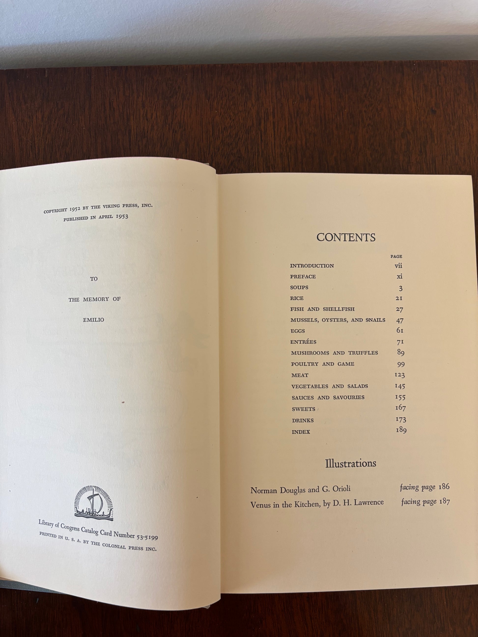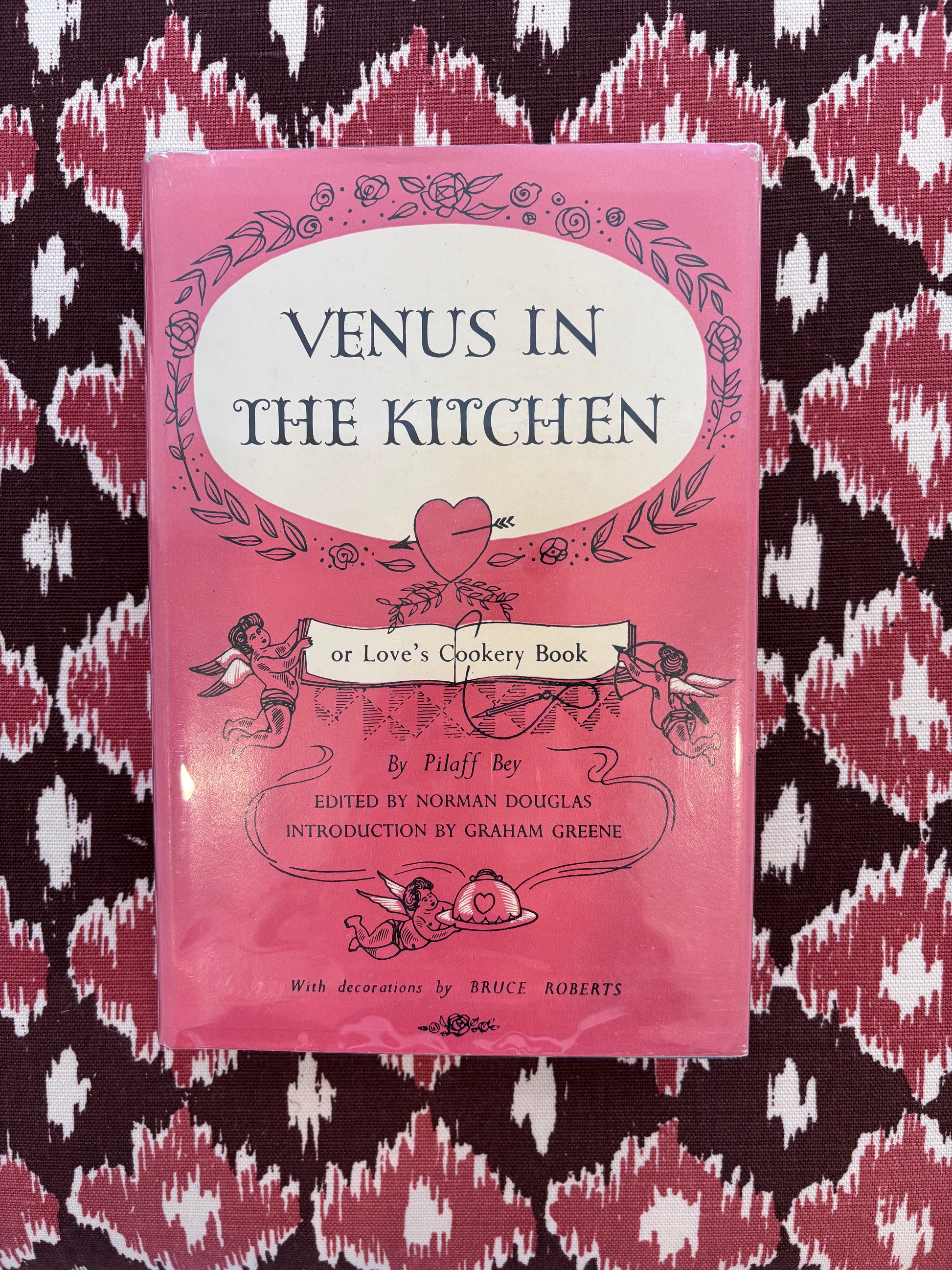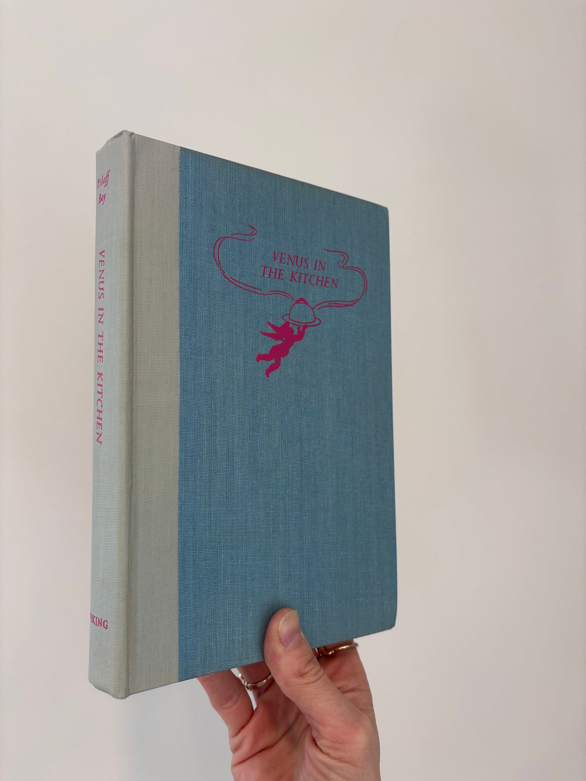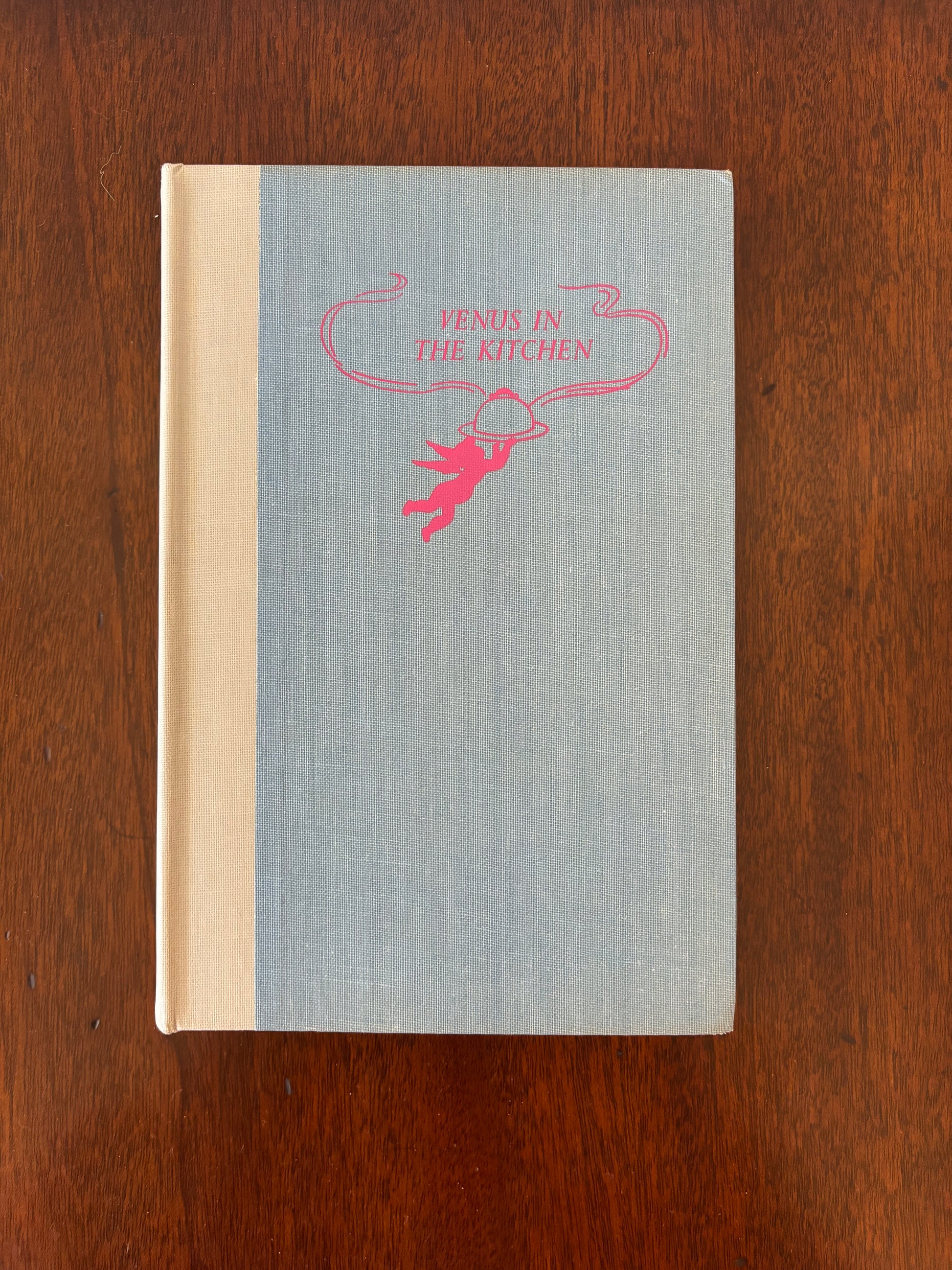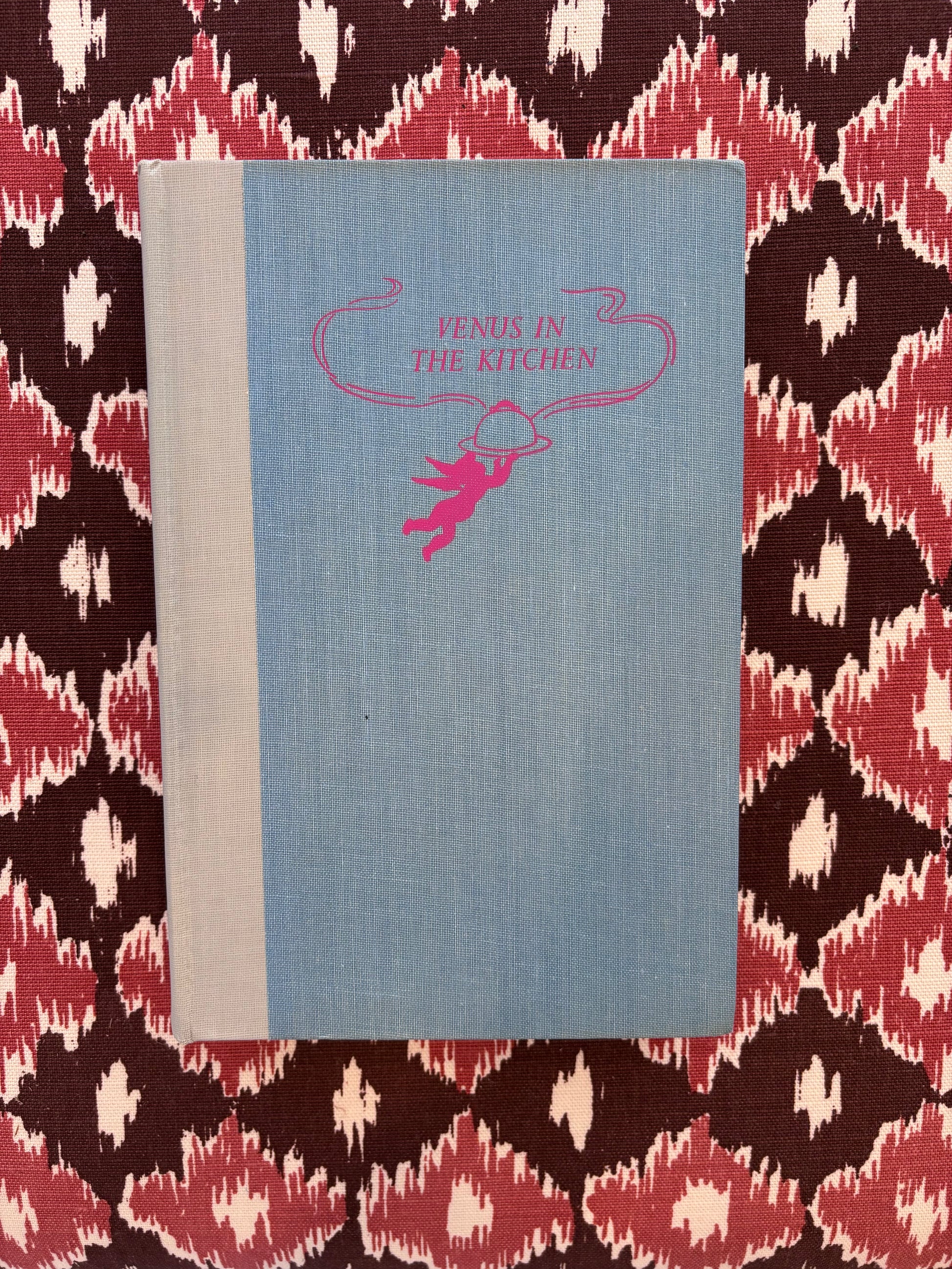 The most charming 1953 cookbook! "Venus in the Kitchen" by Pilaff Bey is a collection of recipes aphrodisiac in nature. With its charming mid-century illustrations and simple recipes it is sure to bring delight to your bookshelf or kitchen! It looks just as good with its jacket off, showcasing a powder blue hardcover with hot pink font. 5.75" x 8.75"