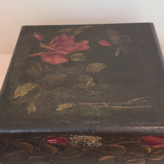 Vintage art nouveau carved box with rose motifs. Inside is a beautiful pale blue silk lining. There is a crack towards the back of the lid. 8" square x 2.75" tall