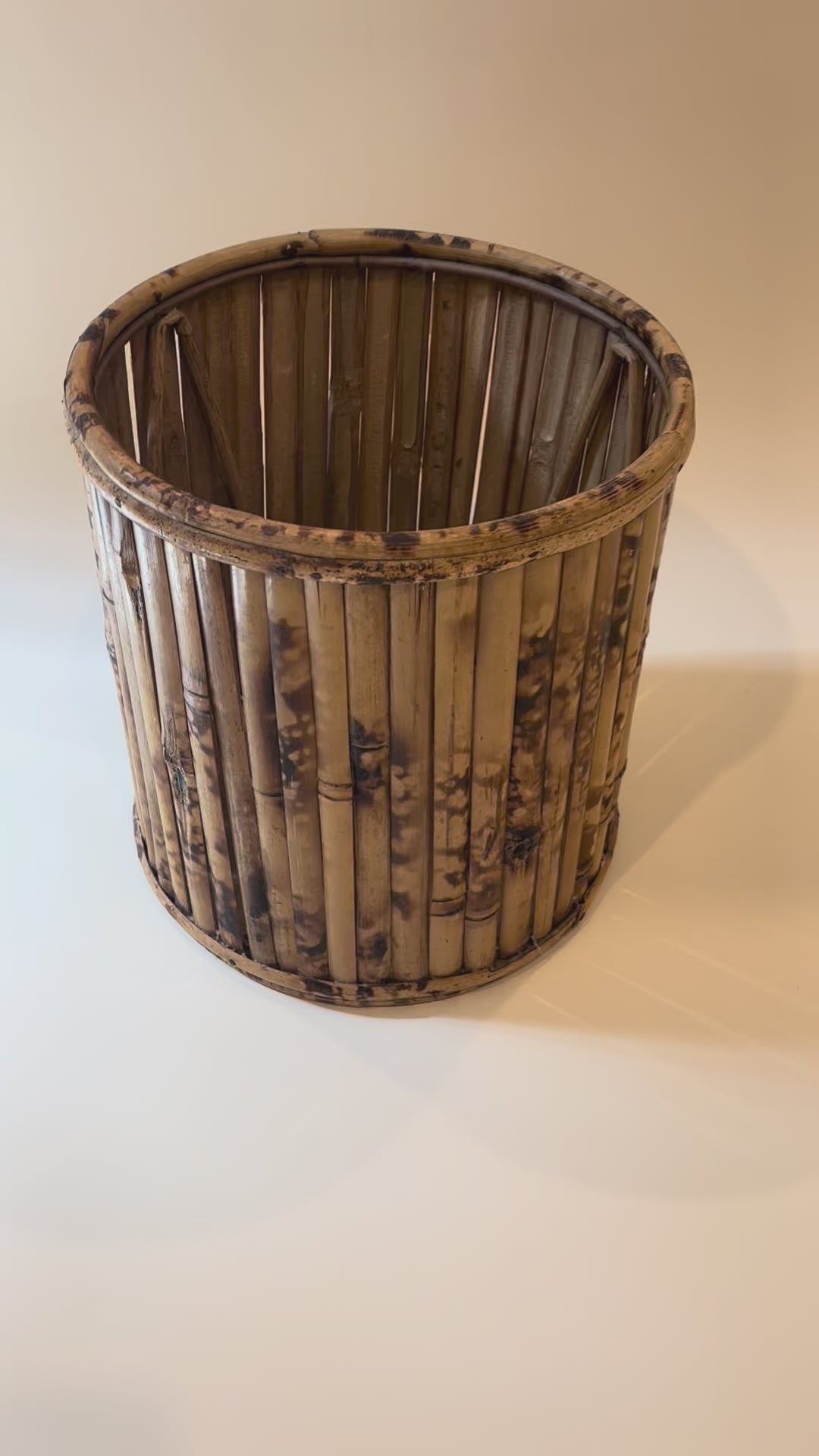 Vintage burnt bamboo wastebasket. 9.75" diameter x 10.5" tall