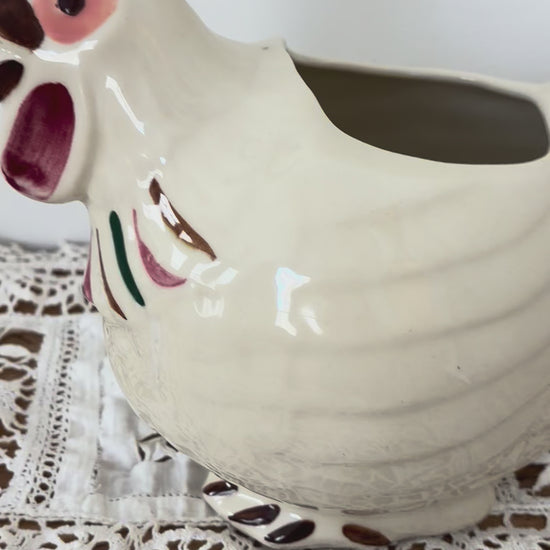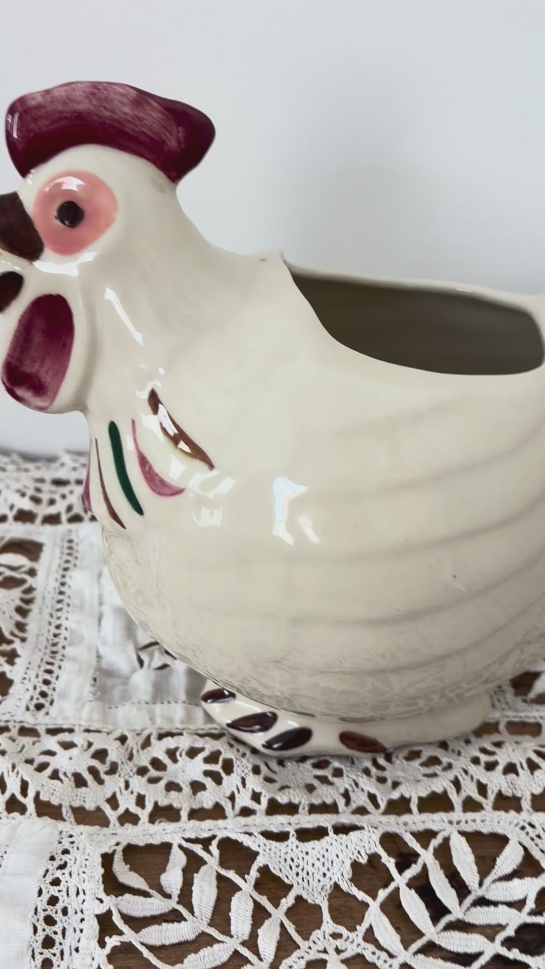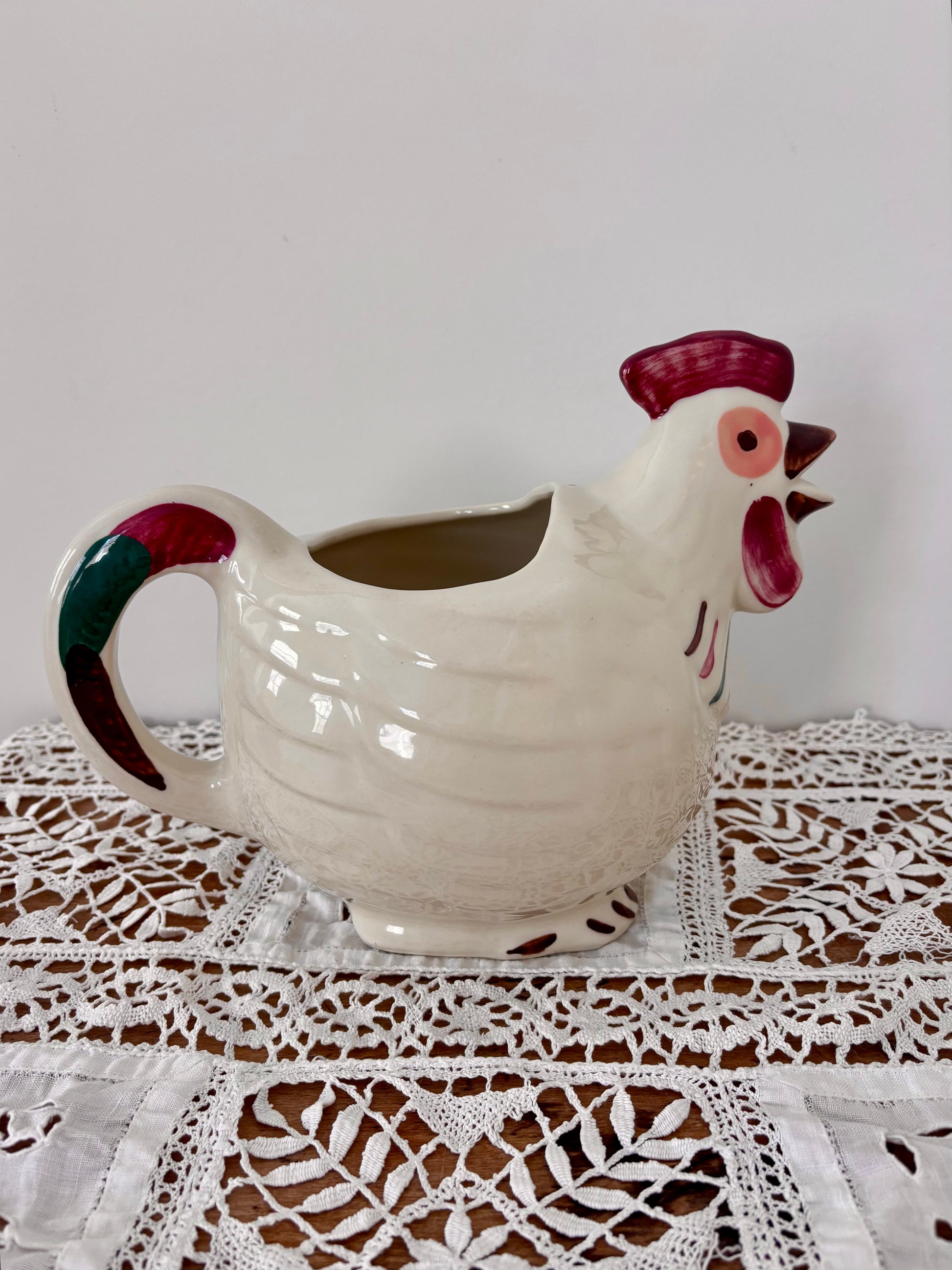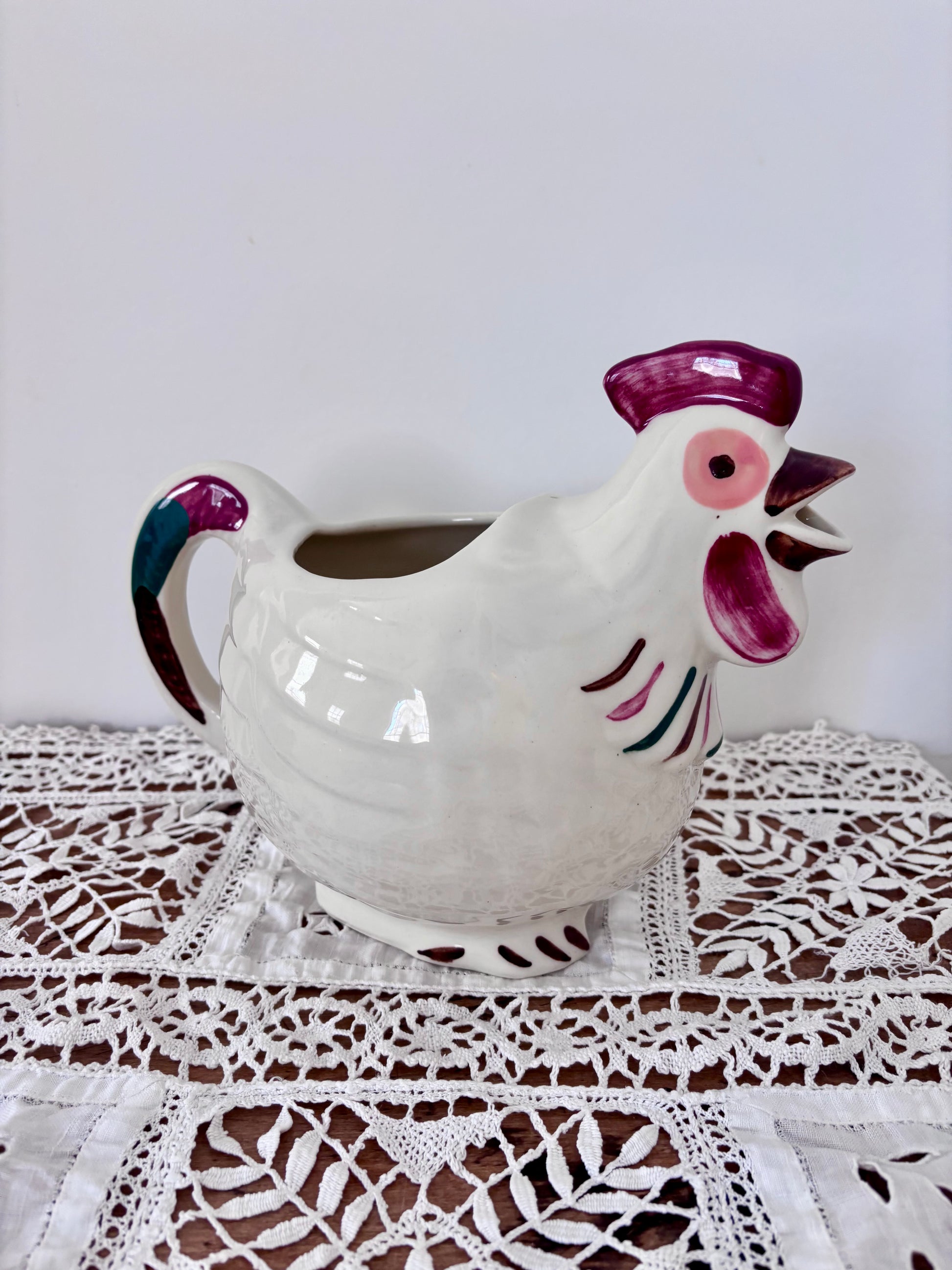 This is a 1940s vintage ceramic rooster pitcher made by Shawnee Pottery. Marked on bottom patented Chanticleer USA and part of Shawnee Pottery's farm animal line. Perfect for adding a touch of farmhouse to your kitchen decor. Was referred to as "Charlie the Chicken". 7.25" h x 10" l x 6" w