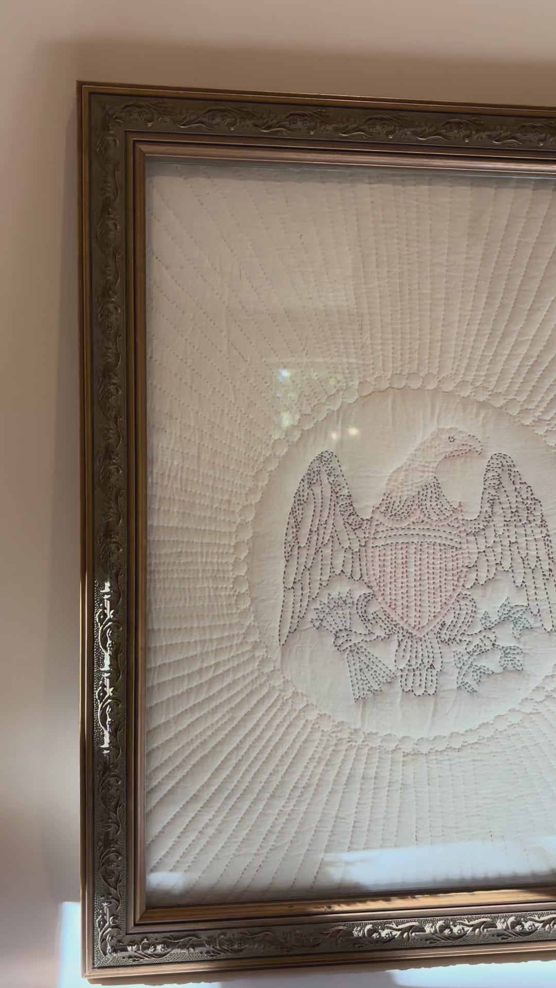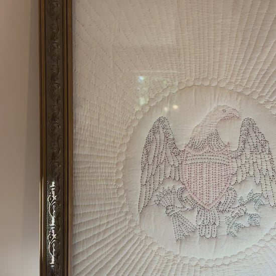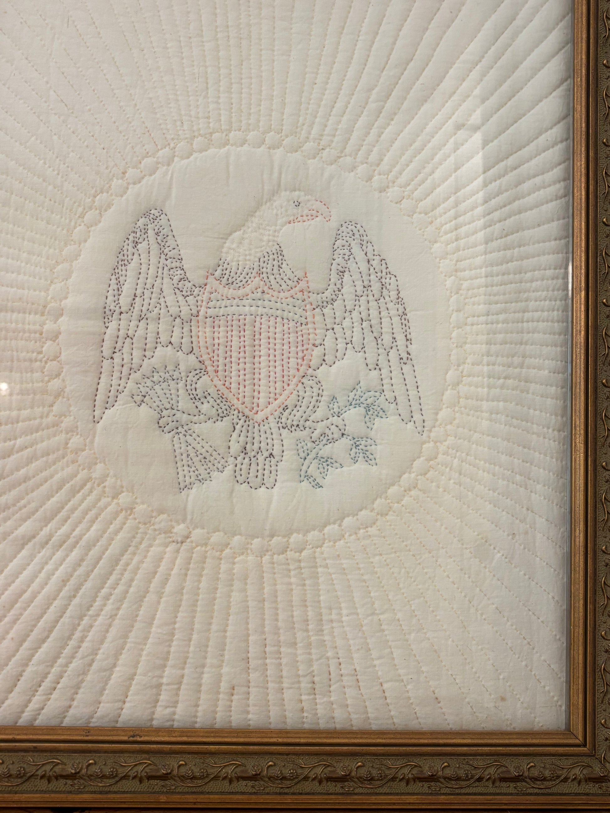Vintage framed quilt remnant featuring a patriotic eagle. It is hand stitched and its head is facing the olive brand, which means it was made during a time of peace. Beautifully framed. 16.5" x 20.5"