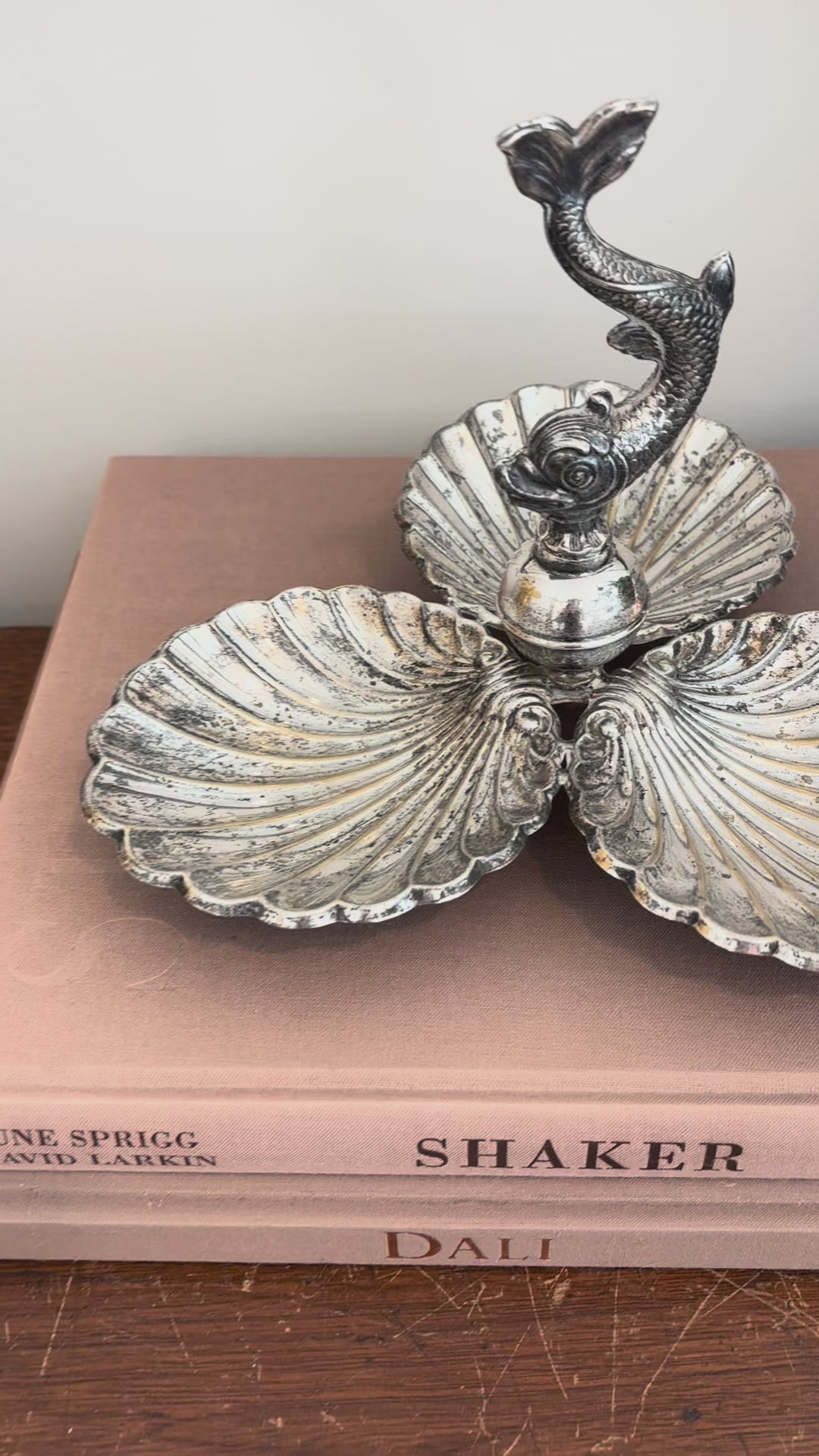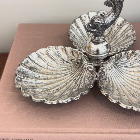 Vintage art deco French three dish server with dolphin and clam shells, commonly used for serving condiments and hors d'oeuvres. Made from silver-plate, it has a beautiful patina. Two of the legs are slightly bent as shown in video but it does not affect its balance. 6" h x 8.5" w