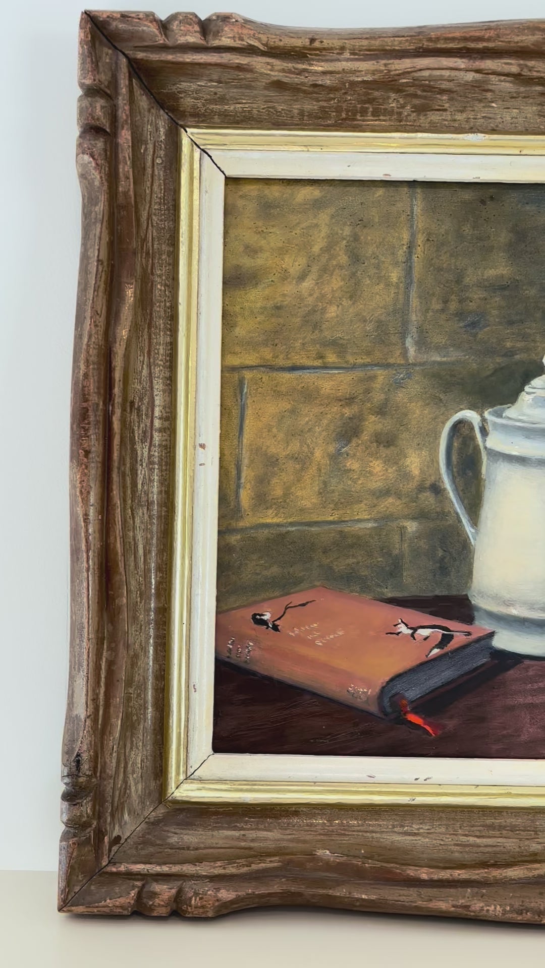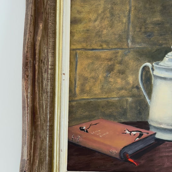 Vintage French mid-century still life oil painting on board in a stately wood frame. Love the detailing on the book, especially the red ribbon bookmark. Will need to add a hook or wire for hanging. 21.75" x 18.5"