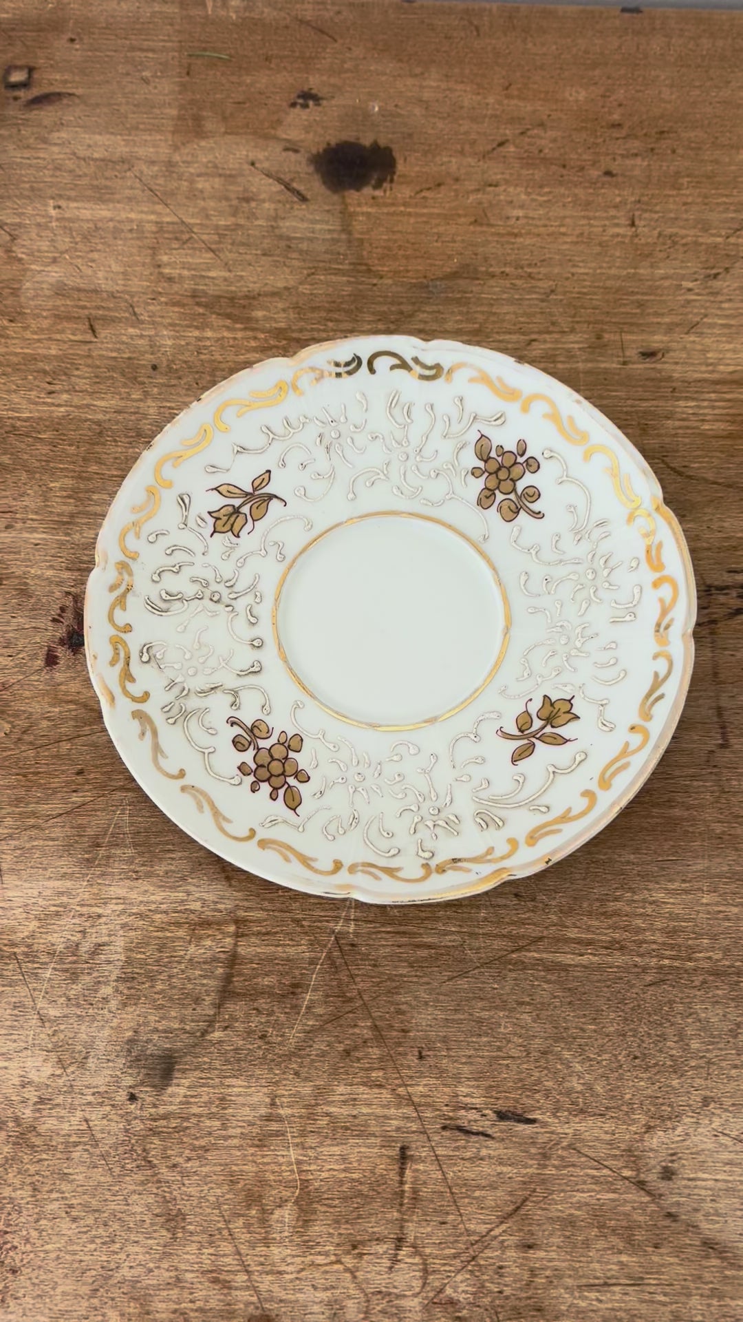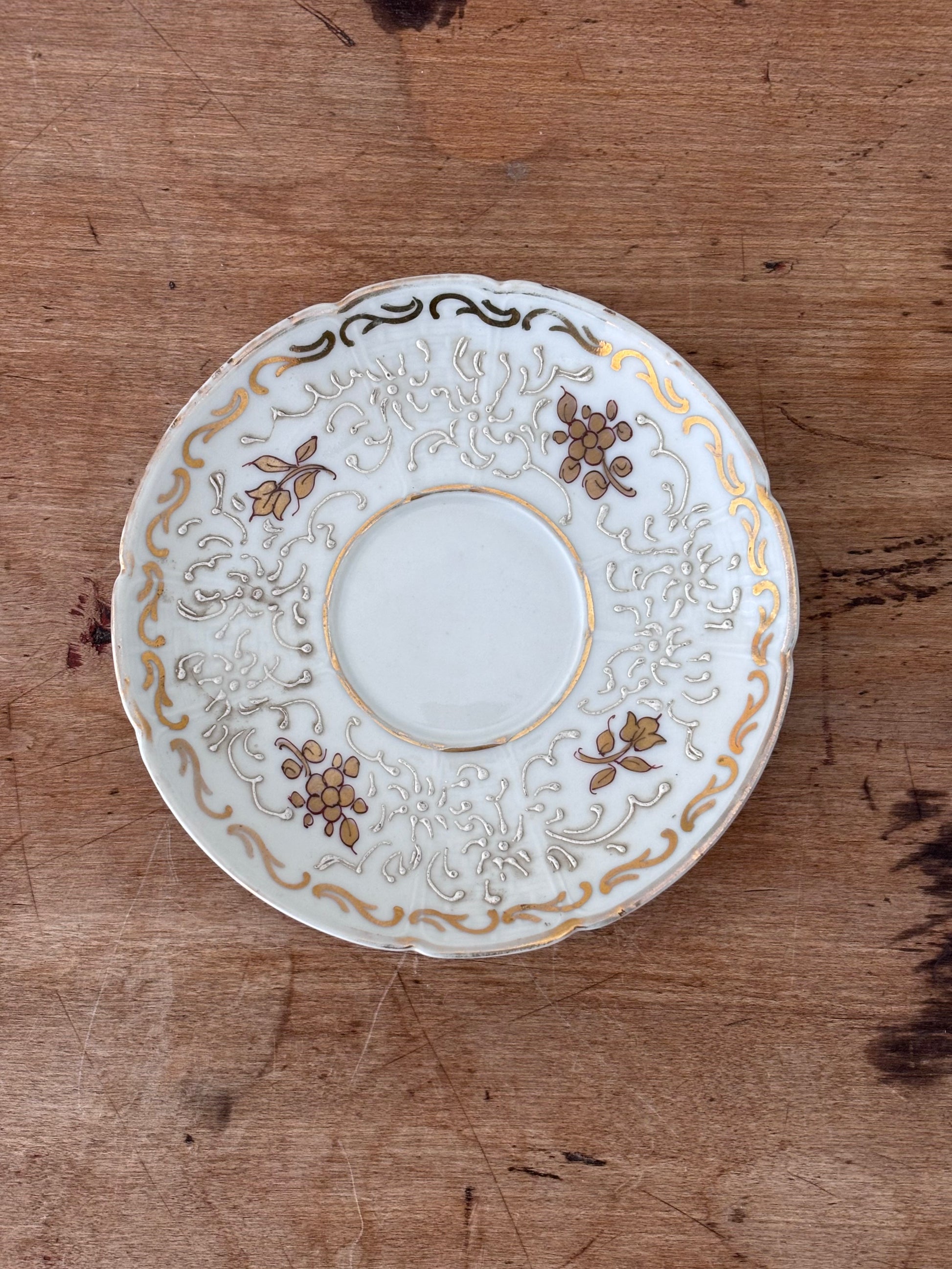 Vintage hand-painted porcelain tea saucer plate from Limoges France. The bottom is marked "décoré main" with an insignia, meaning it is indeed hand-painted. The perfect petite size for holding a pillar candle, some special jewelry or even soap in a bathroom. Gold trim has wear, consistent with its age. 5.5" diameter