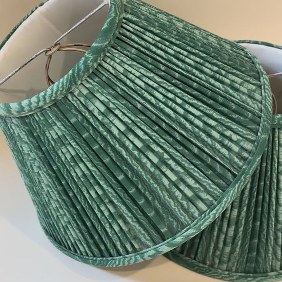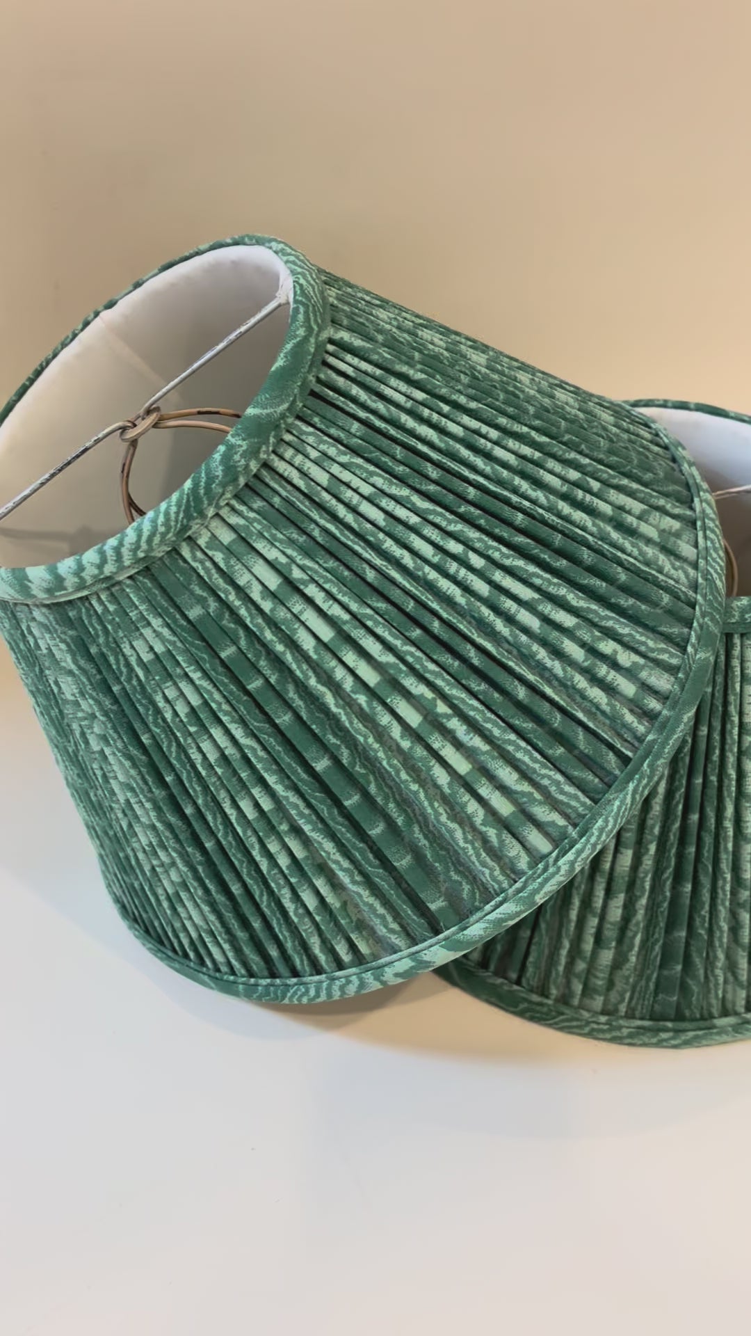 Vintage pair of pleated green patterned lampshades. These custom-made lampshades are expertly crafted and in beautiful condition. These clip on to the top of a bulb. Each is 10" diameter x 5.5" tall