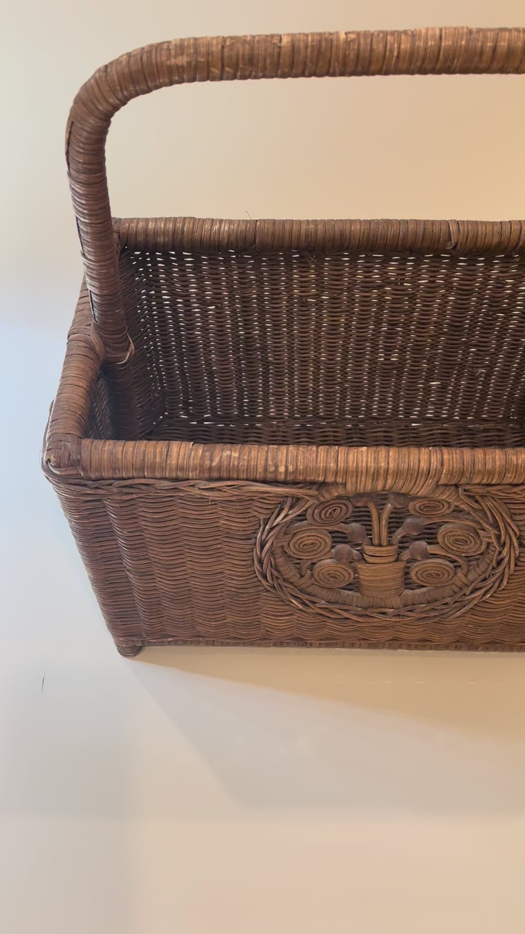 Vintage wicker basket magazine holder with charming design. 15" long x 8.5" deep x 10.5" tall (17" to top of handle).